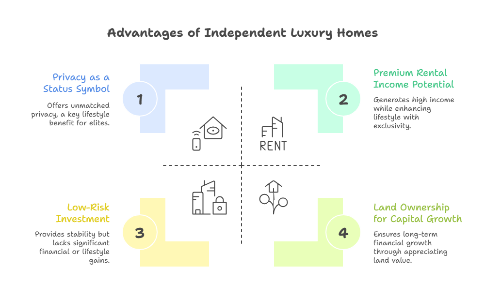For India’s wealthy, land ownership represents permanence and power. A luxury home built on owned land is not just a residence; it is an inheritable asset that strengthens generational wealth. This is why Independent Luxury Homes consistently outperform apartments in long-term appreciation.